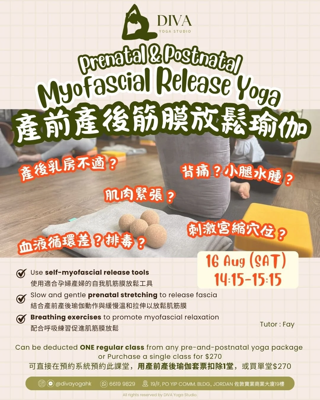 Can be deducted ONE regular class from any prenatal yoga package or Purchase a single class for $270 可直接在預約系統預約此課堂,用孕婦瑜伽套票扣除1堂,或買單堂270