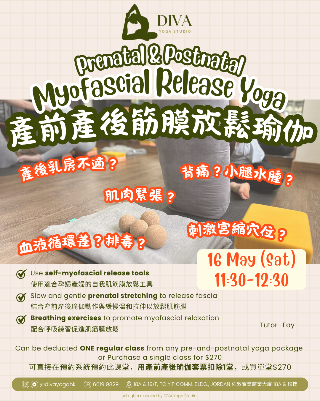 Can be deducted ONE regular class from any prenatal yoga package or Purchase a single class for $270 可直接在預約系統預約此課堂,用孕婦瑜伽套票扣除1堂,或買單堂270